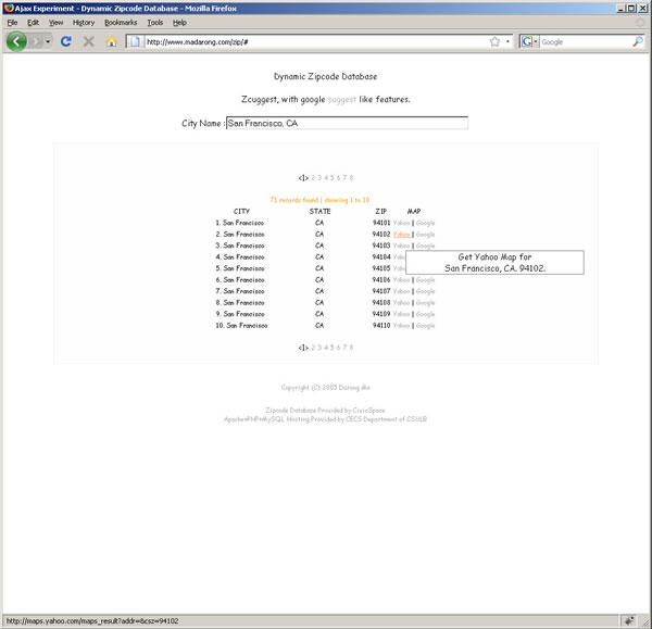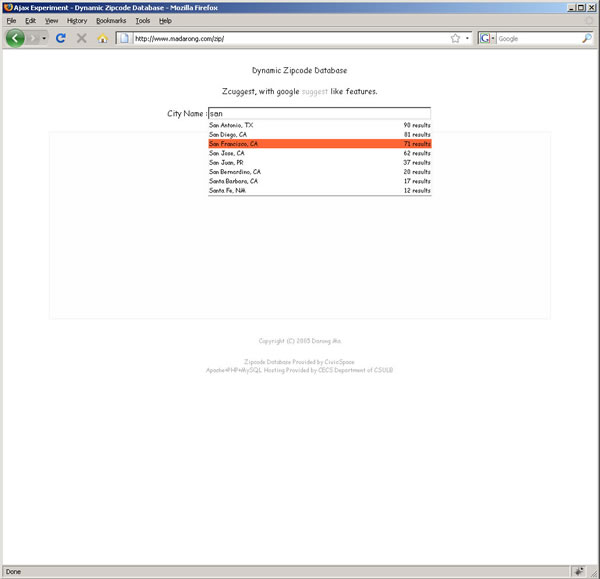 An interactive ajax based zipcode database. It Uses Php, Mysql and Ajax to provide zipcode results as you type in the city name. It is similar to the google suggest feature.